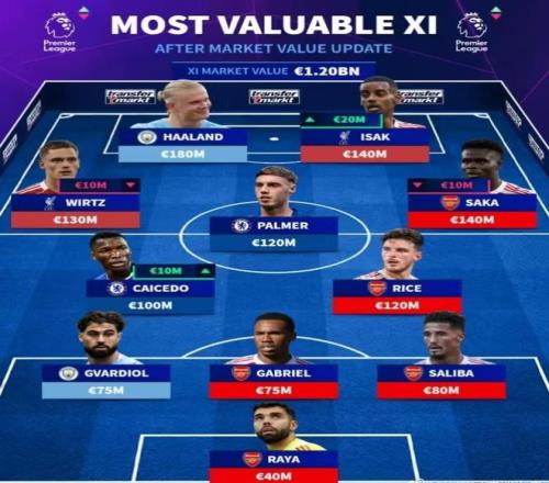 雷速体育10月18日报道宣称 德国转会市场于近日更新了英超联赛的球员市值,并列出了一个阵型为3-5-2的最贵11人阵容。在这个总身价高达12亿欧元的阵容中,阿森纳有5名球员入选,切尔西、利物浦、曼城则分别有2人入选。