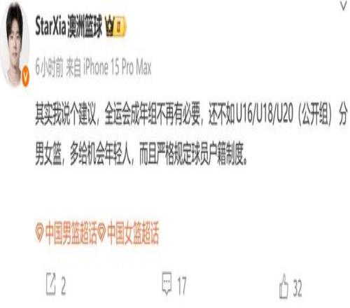 外界吐槽全运会的鸡肋,已经不是一天两天了,这些为了给高层领导增添功绩的比赛,对于中国男篮的成长确实不是一件好事。所以在输给韩国赛后,媒体人Starxia澳洲篮球就建议,全运会成年组没有必要继续存在了:“全运会成年组不再有必要,还不如U16/U18/U20(公开组) 分男女篮,多给机会年轻人,而且严格规定球员户籍制度。”